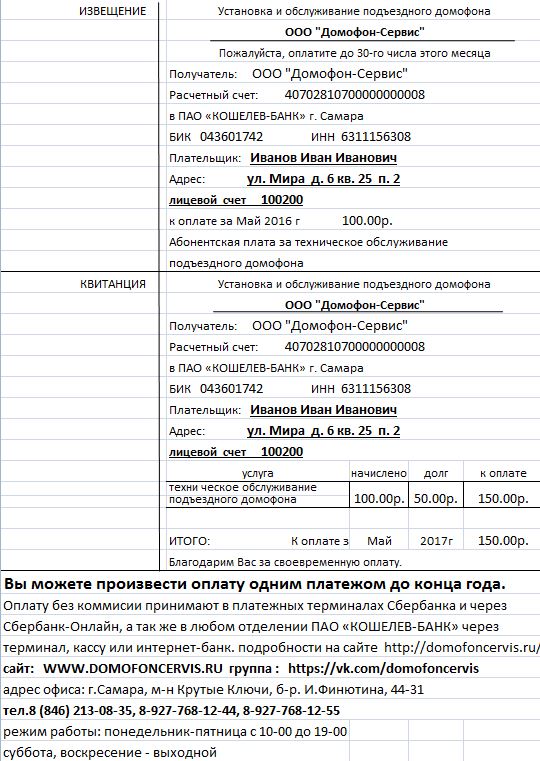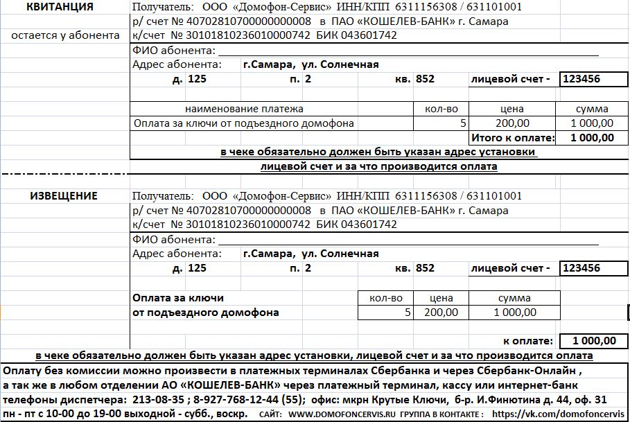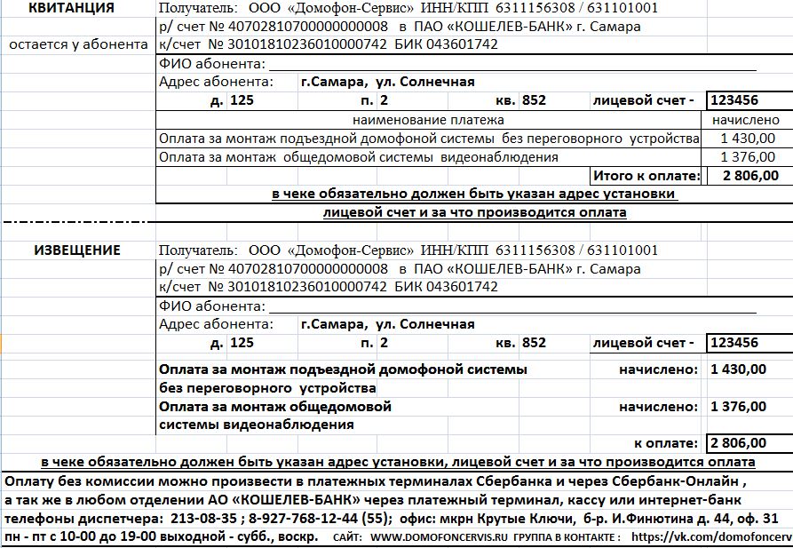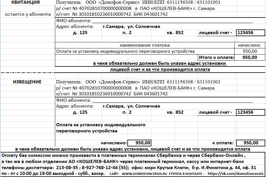 Квитанция за установку индивидуального переговорного устройства